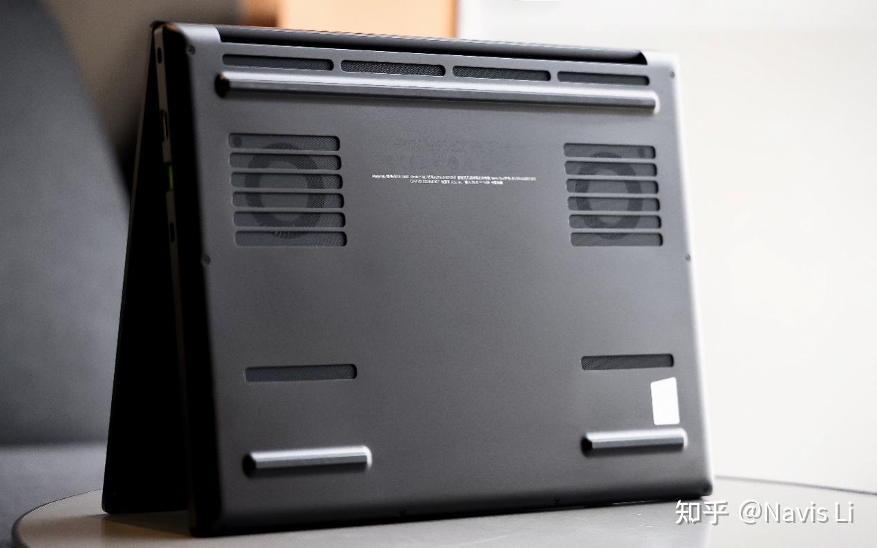 可以明显的看到,灵刃14 的底部散热孔相比传统后出风式机型要更多,而且为了避免屏轴对风道造成遮挡,还额外在上方区域增加了一条散热孔来辅助散热,下方区域也同样如此。