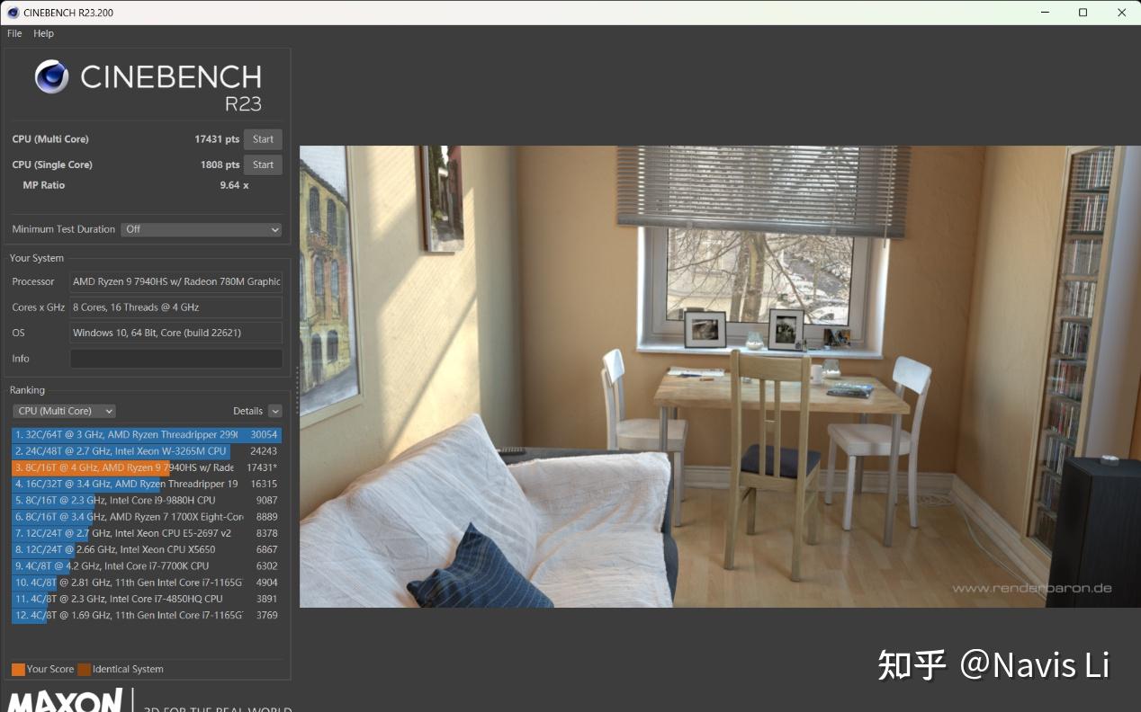 在R23中,锐龙9 7940HS 单核可以做到1808pst,多核达到17431pst,相比上一代有着明显的提升。