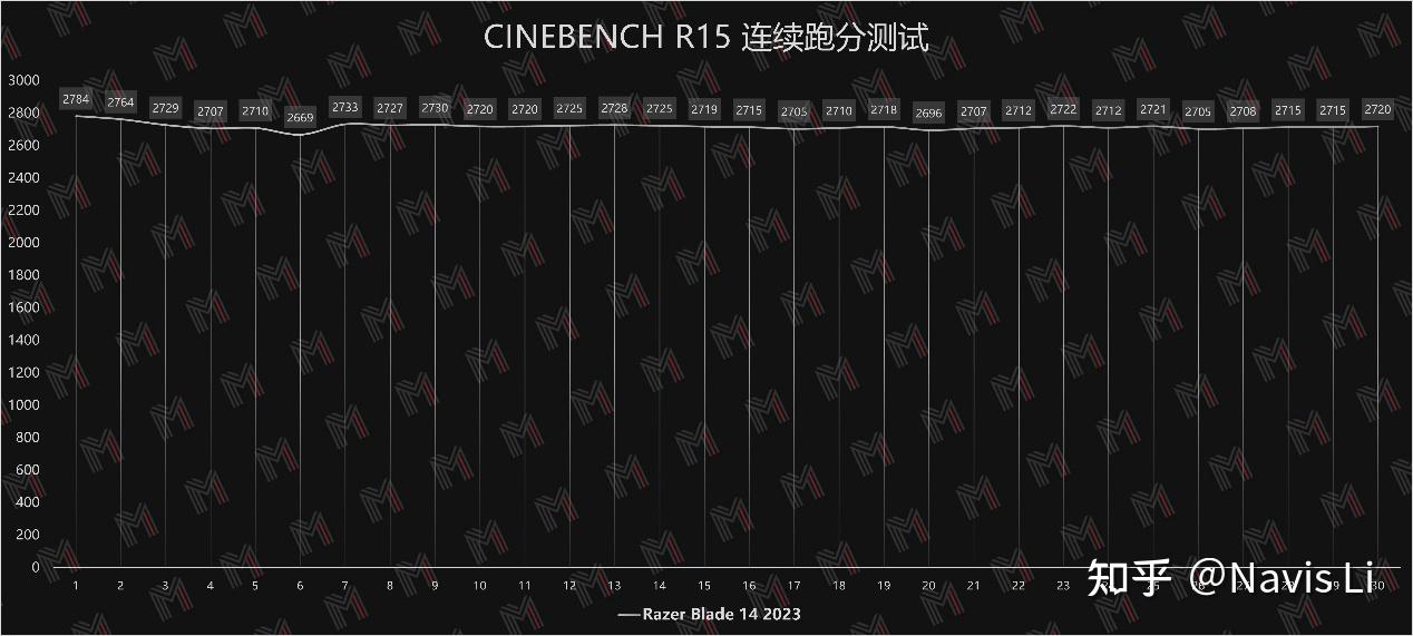 首次峰值性能可达2784pst,6次后机内温度稳定,平均可达2716cb,高低差值很小,连续负载近乎呈一条直线,这说明灵刃14长期负载CPU 性能释放十分平稳。