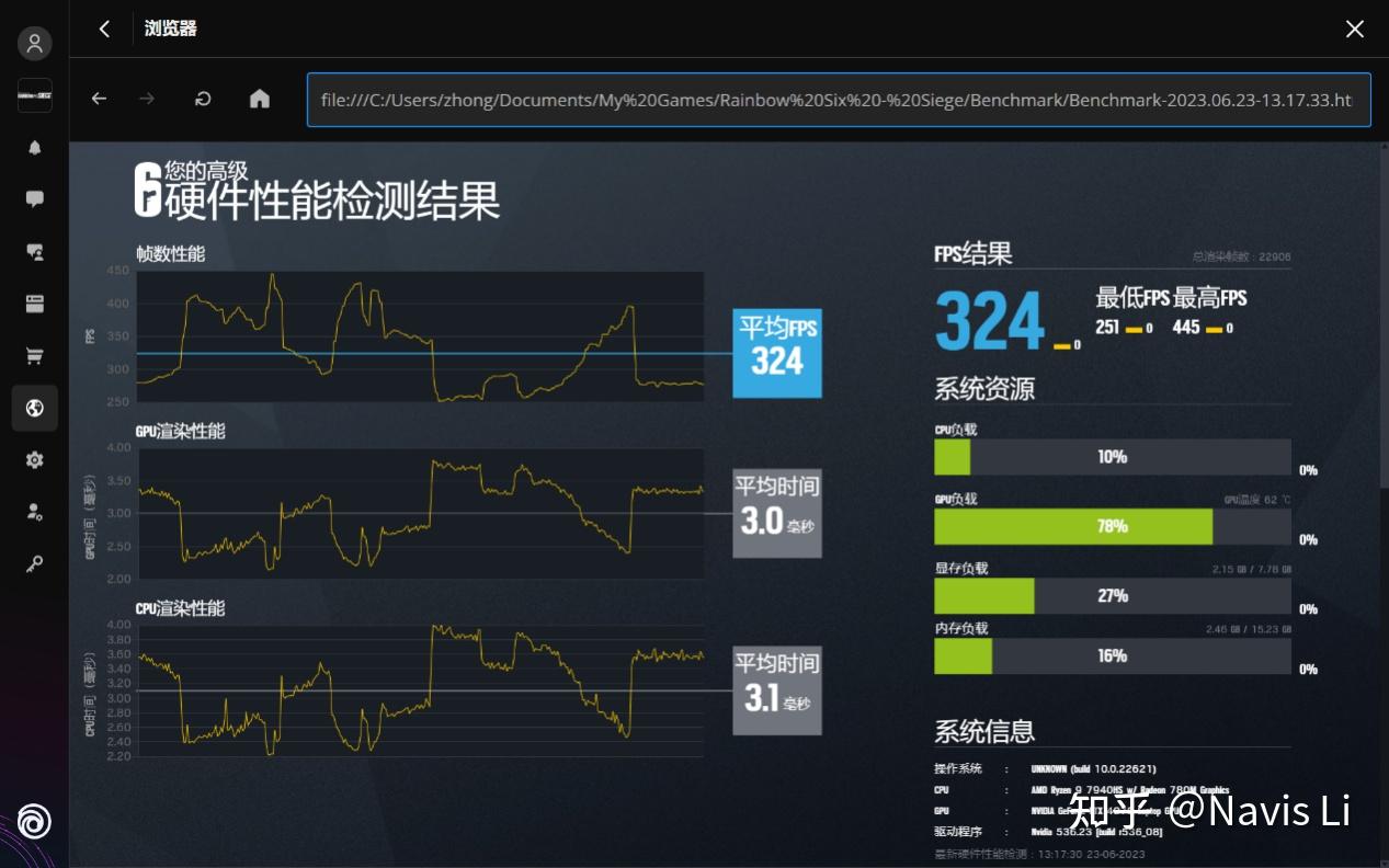 再看FPS 类游戏彩虹六号围攻,在FHD 高画质下可以做到324FPS,可以完美发挥出灵刃240Hz 高刷屏优势。