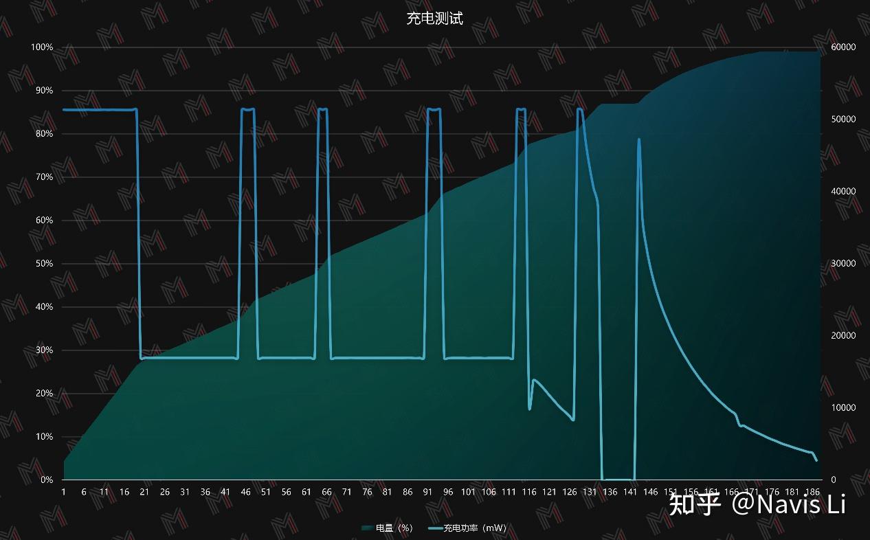 而在充电方面,用标配电源进行测试,可以看到灵刃14 的充电策略有些奇怪,会在50W~23W之间横跳,充至85%的时候还有输入为0的情况。充至80%大概需要125分钟,这方面需要改善。