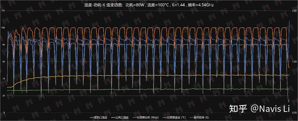 我们也记录了出风口温度变化,通过它可以算出来整机的散热效率 K,K值越高说明它的散热效率越好。最终灵刃14 2023 的K 值达到了1.4,已经与游戏本近乎持平(平均1.5),这说明灵刃这套均热板散热效率很高,能够快速将机身热量导出到机外。