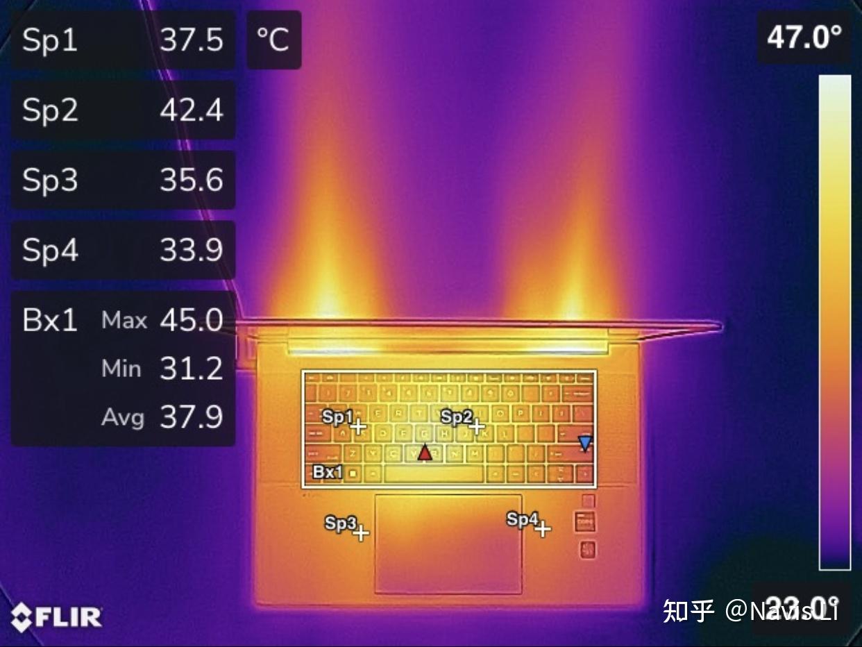 当机内温稳定后,可以看到键盘核心区域平均温仅在38°C附近,由于内部散热没有改,所有高温区域依旧位于键盘中下位置,好在温度并不高。左手(点1)在37°C附近,右手(点2)为42°C,整体表现还还是比较不错的,即便极限情况下依旧不会有烫手的不适感。
