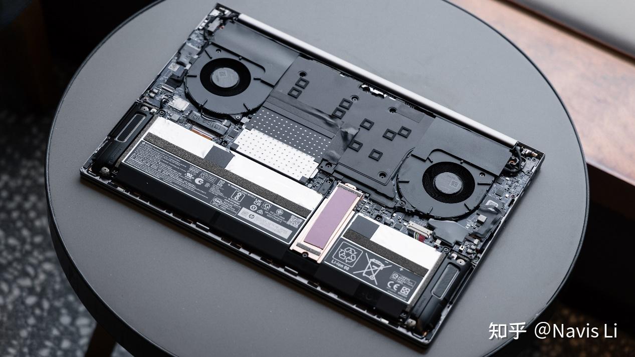 整体的散热结构和布局基本与上一代完全相同,依旧很扎实且规整。散热使用HP Vaporforce散热技术,采用的是均热板+双风扇后出风设计,可以看到CPU和显卡以及供电等核心部件均被均热板覆盖。整体的散热看上去还是很扎实的,理论上可以防止工作站的过热问题,让机型性能处于最佳工作负载。