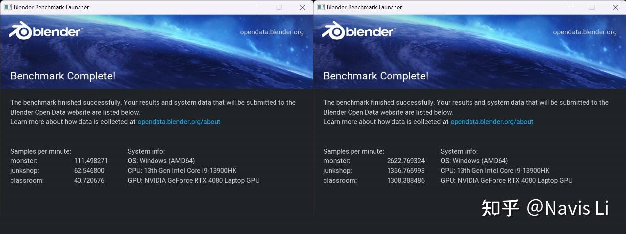 在Blender 的测试中,分别测试了CPU 和GPU,各项成绩几乎均可以超越大部分主流游戏本。