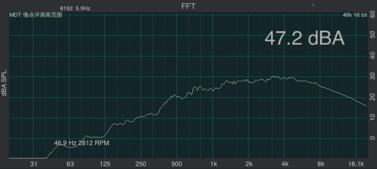 在噪音方面,双风扇满载时人位噪音为47.2 dBA并不算高,整体曲线也没有明显异响,而在日常使用中,只有在夜深人静时才能勉强提到风扇在转动。