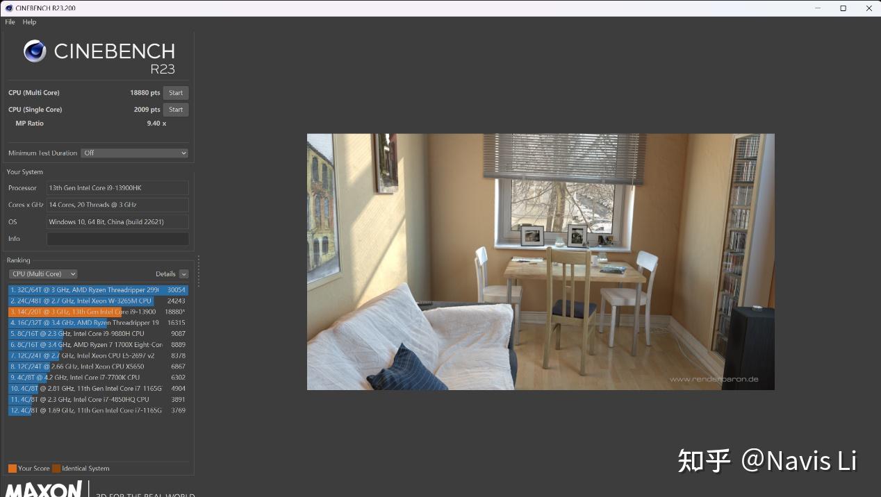 我手中这台CPU 为13代酷睿i9-13900HK,拥有6P+8E 14核心20线程,睿频可达5.40 GHz,实测以55W功耗做到了单核2009pts,多核18880 pts的成绩,不愧为i9HK,性能表现很出色。