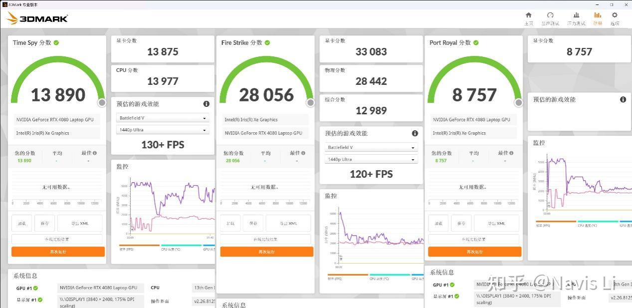 在显卡方面,ZBook Studio提供了RTX2000~4000专业卡和RTX40系游戏卡,我手中这台为RTX4080,3DMARK 实测如下: