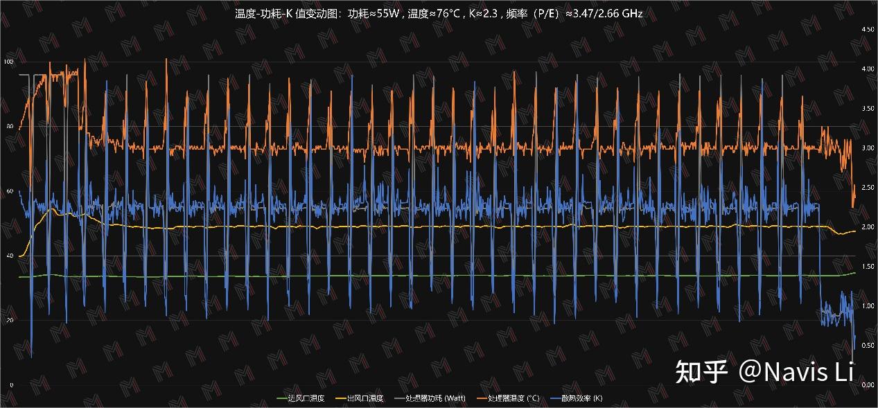 从记录的测试过程可以看到,ZBook Studio搭载的这颗i9-13900HK首次顺时功耗给到了96W,后续稳定功耗为55W,此时CPU 温度并不高,仅在76°C附近,调教的相对保守,P核频率在3.47、E核为2.66。