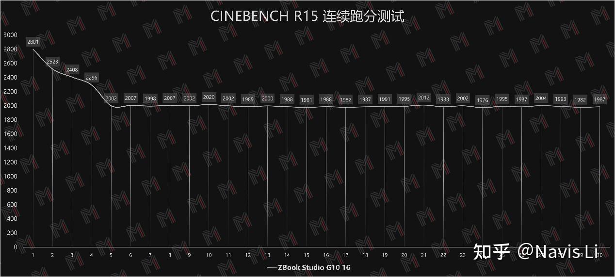 首次峰值性能可达2801 pst,高性能释放维持时间比较持久,后续可维持在2000pst附近,整体性能发挥很平稳,数据呈一条直线,这说明ZBook Studio长期负载CPU 性能释放十分平稳。