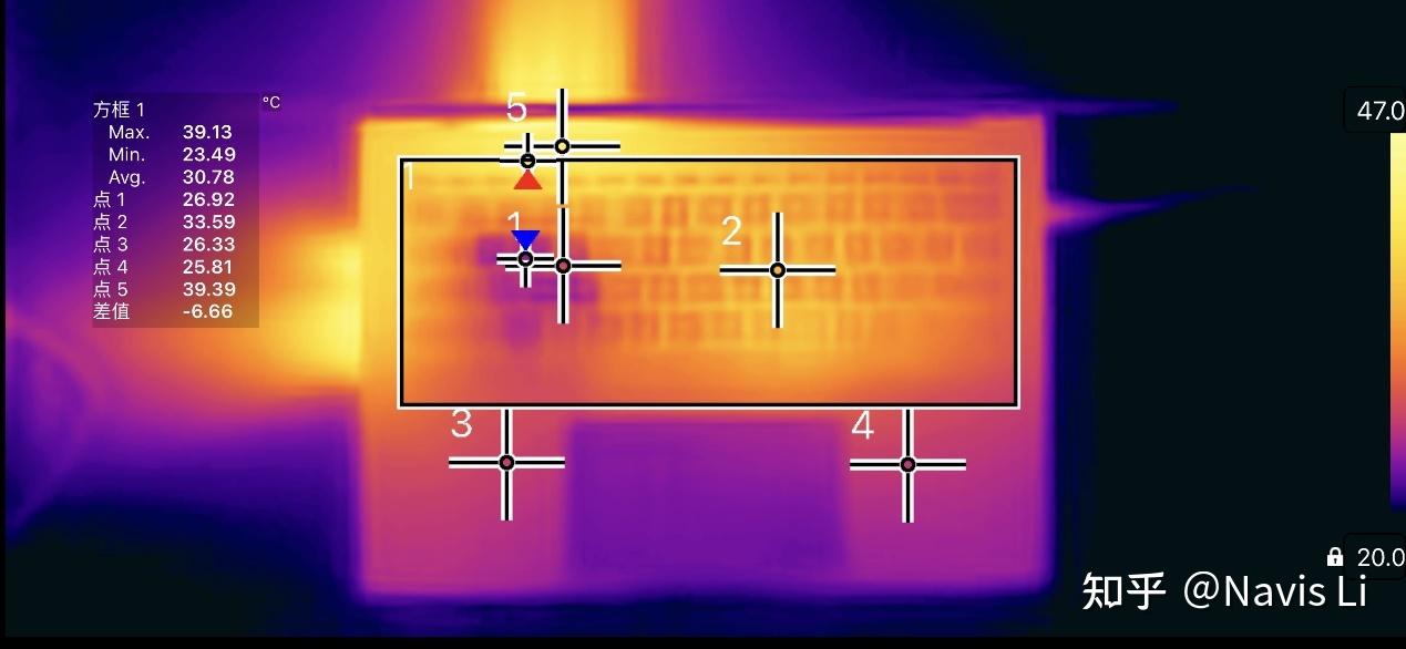 在进一步的压力测试中,我们也记录了键盘表面温度,可以看到灵耀14 2023 旗舰版键盘平均温仅在31°C附近,最高温为39°C位置也在功能键上方,并不影响使用。左手区域(点1)位于风扇正上方,所以温度基本就比室温高些,右手(点2)也只达到34°C附近,整体来看,灵耀键盘温度控制还是很出色的。