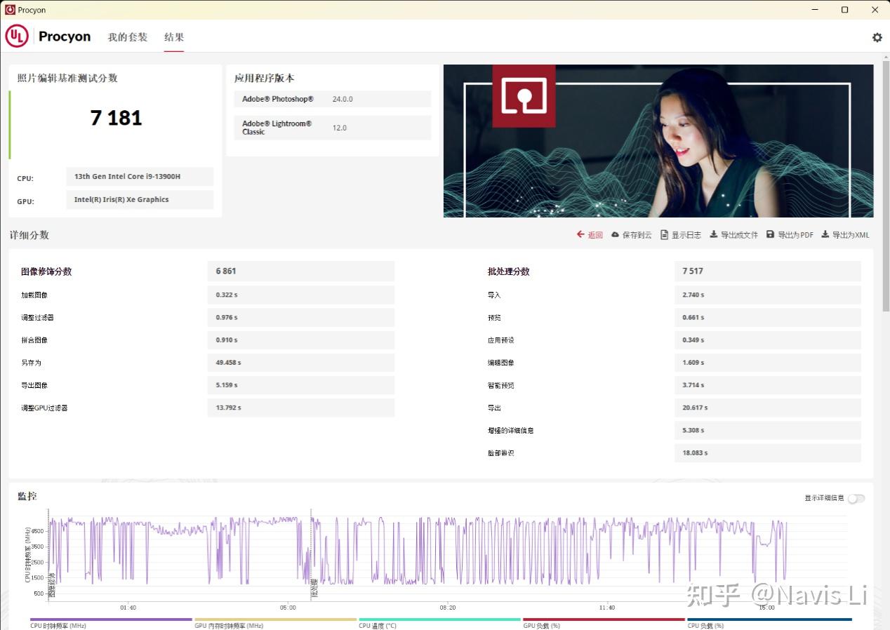 接着是Photo Editing测试,7181 的成绩也代表着它可以胜任绝大部分的日常使用需求,尤其是32GB大内存版本,可同时加载、处理的文件也可以更多,基本上不用担心爆内存。如果你有视频编辑需求的话,则建议购买独显版了。
