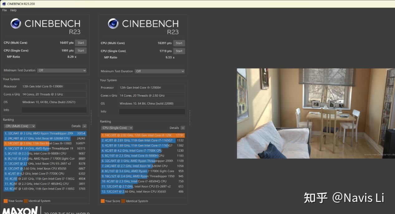 在R23的测试中可以看到,单核成绩可以做到 1991 pst,多核为 16497,单核和多核成绩均超过了之前测试的80W的i9-12900H,尤其是单核成绩提升达15%,灵耀14 的这个表现还是很出色的。