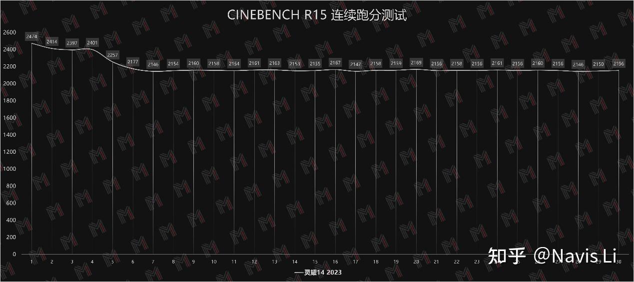 我手中这台灵耀14 2023 旗舰版为i9-13900H,按照惯例我们先对它进行CINEBENCH R15 连续跑分测试,目的就是为了直观地展现出CPU 单独负载性能变化。