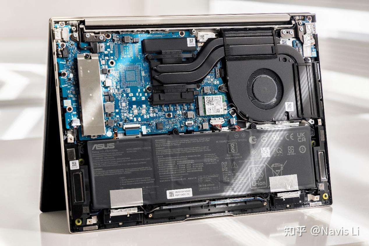 灵耀14 2023 旗舰版的内部设计还是很规整的,USB 接口通过排线与主板相连,下方电池达到了70Wh,散热系统采用的是单风扇双热管左+后的风道设计。