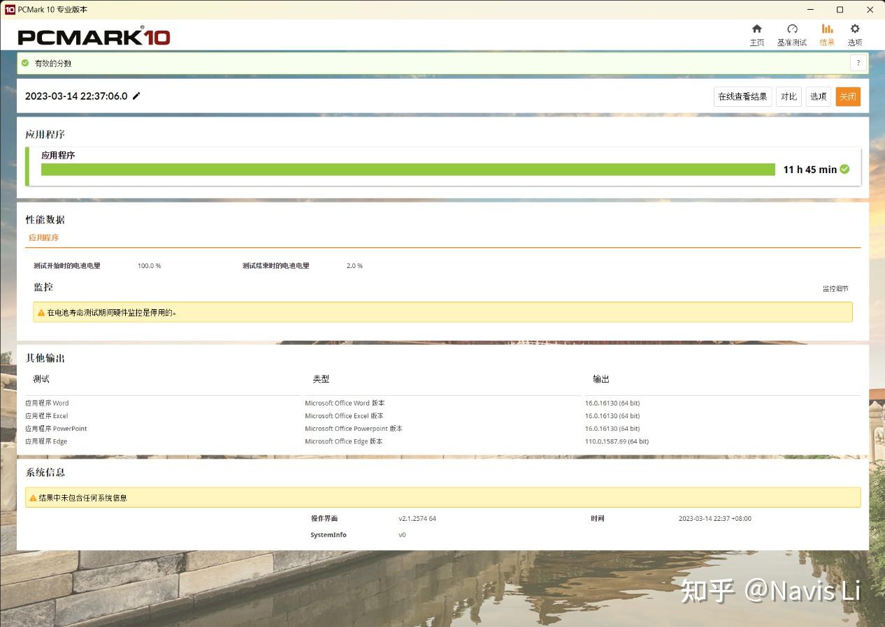 实测115尼特屏幕亮度下,灵耀14 2023 旗舰版PCMARK10 应用程序续航可以做到11h45min,平均每小时在5.9W左右,这个表现还算可以,基本可以满足一天的续航需求。