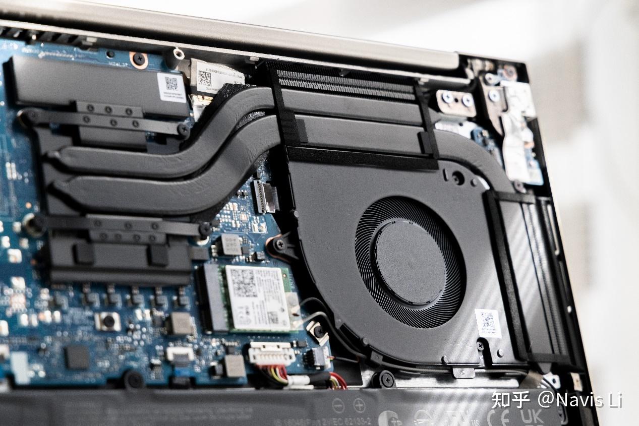 双热管采用的是6mm+8mm 规格,两侧出风口均有厚实的鳍片,风扇的叶片也很密集,对于核显版本的机型来说,理论上不会有太大压力。