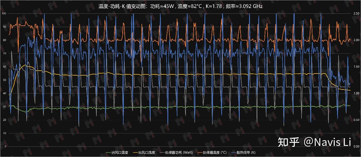 从机身进/出风口的温度以及CPU功耗我们可以判断它的散热效率K,我们认为出风口温度越接近核心温度,就意味着散热效率 K 越高,这个机器的散热表现也就越好。