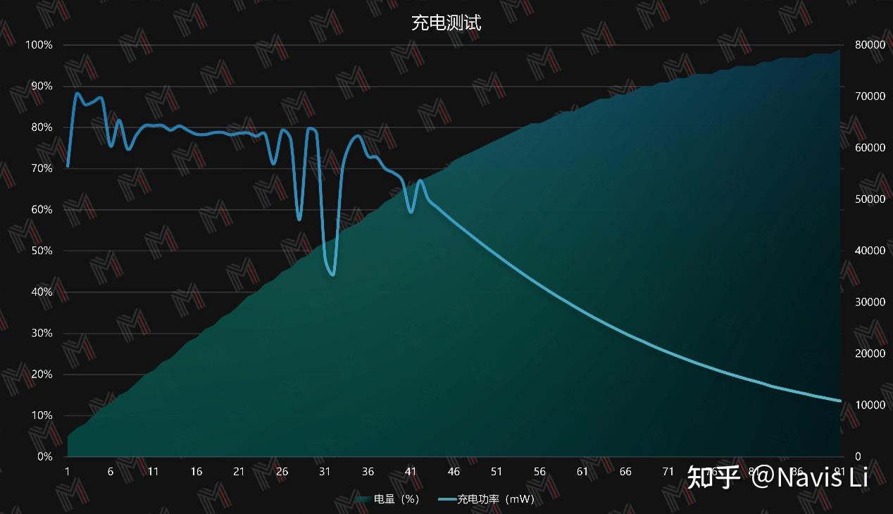 最后是快充,可以看到前半小时输入还是很高的,可以达到65W左右,37分钟可充至60%,54分钟充至80%,已经能够满足一般的应急需求,充满则需要80分钟。