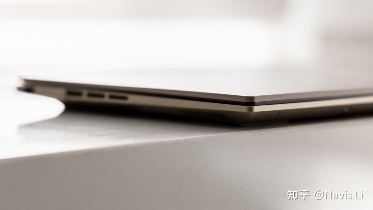 首先在设计上,特殊的等离子陶瓷镀层技术,让原本金属机身也拥有了温润的触感,再结合皓沙金配色,以及A面极简的高亮线条点缀,使它的颜值直接盖过了绝大多数轻薄本。