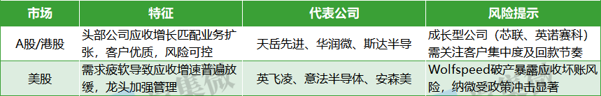 17家第三代半导体上市公司应收账款特征总结整体看,A股/港股公司应收账款增长总体健康,头部公司效率更优,成长型公司需警惕客户集中度过高带来的回款风险。美股公司行业周期底部特征明显,应收规模收缩或低增,Wolfspeed破产案例提示应收账款管理需结合客户信用风险动态评估。