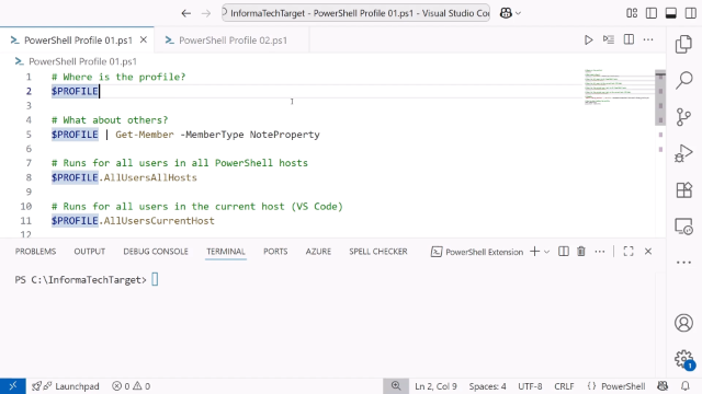 <p>If you run the same commands every time you launch the PowerShell console, consider modifying your PowerShell profile for a better overall experience.</p><div class="ad-wrapper ad-embedded"> <div id="halfpage" class="ad ad-hp"> <script>GPT.display('halfpage')</script> </div> <div id="mu-1" class="ad ad-mu"> <script>GPT.display('mu-1')</script> </div> </div> <p>The PowerShell profile loads your settings whenever you launch PowerShell to customize the environment to your needs. You define your settings as a PowerShell script, making the process straightforward. This article will explain the concepts behind the PowerShell profile, how to edit it for the various PowerShell consoles -- <a href="https://www.techtarget.com/searchwindowsserver/definition/PowerShell">PowerShell</a>, Windows PowerShell, Visual Studio Code (VS Code), Integrated Scripting Environment (ISE) -- and several useful additions to incorporate to enhance your workflow and avoid potential issues.</p> <section class="section main-article-chapter" data-menu-title="What is the PowerShell profile?"> <h2 class="section-title"><i class="icon" data-icon="1"></i>What is the PowerShell profile?</h2> <p>The PowerShell profile is simply a PowerShell script that runs every time you launch PowerShell, except when you launch PowerShell with the <b>-NoProfile </b>flag. The location of the profile varies depending on several conditions:</p> <ul class="default-list"> <li>The version of PowerShell (Windows PowerShell vs PowerShell)</li> <li>Is the profile for all users or the current user?</li> <li>Is the profile host application specific? (ISE, VS Code, etc)</li> </ul> <p>The following lists are directories. The names of the profile scripts depend on the host application.</p> <p>For all users, the profile is located here:</p> <ul class="default-list"> <li>Windows PowerShell: $PSHOME\</li> <li>PowerShell:</li> <li>Windows: $PSHOME\</li> <li>Linux: /usr/local/Microsoft/powershell/7/</li> <li>macOS: /usr/local/Microsoft/powershell/7/</li> </ul> <p>For specific users, the profile is located here:</p> <ul class="default-list"> <li>Windows PowerShell: $HOME\Documents\WindowsPowerShell\</li> <li>PowerShell</li> <li>Windows: $HOME\Documents\PowerShell\</li> <li>Linux: ~/.config/powershell/</li> <li>macOS: ~/.config/powershell/</li> </ul> <p>In these directories, you can have several valid profile files. The difference between the profiles is based on the host application that launches PowerShell. For this tutorial, we will use the ISE and VS Code as examples for hosts:</p> <ul class="default-list"> <li>All hosts: profile.ps1</li> <li>ISE: Microsoft.PowerShellISE_profile.ps1</li> <li>VS Code: Microsoft.VSCode_profile.ps1</li> </ul> <p>If a user launches PowerShell in VS Code, the following profiles could run on Windows:</p> <ul class="default-list"> <li>All users, all hosts: $PSHOME\profile.ps1</li> <li>All users, VS Code: $PSHOME\Microsoft.VSCode_profile.ps1</li> <li>Current user, all hosts: $HOME\profile.ps1</li> <li>Current user, VS Code: $HOME\Microsoft.VSCode_profile.ps1</li> </ul> <p>If any of the files don't exist, PowerShell skips that profile.</p></section> <section class="section main-article-chapter" data-menu-title="How to access the PowerShell profile"> <h2 class="section-title"><i class="icon" data-icon="1"></i>How to access the PowerShell profile</h2> <p>The easiest way to access PowerShell's profile is through PowerShell itself. There's no need to remember any of the listed paths because they are all stored in a variable called <b>$Profile</b>.</p> <figure class="main-article-image full-col" data-img-fullsize="https://www.techtarget.com/rms/onlineimages/ahowell_psprofile_image1-f.jpg"> <img data-src="https://www.techtarget.com/rms/onlineimages/ahowell_psprofile_image1-f_mobile.jpg" class="lazy" data-srcset="https://www.techtarget.com/rms/onlineimages/ahowell_psprofile_image1-f_mobile.jpg 960w,https://www.techtarget.com/rms/onlineimages/ahowell_psprofile_image1-f.jpg 1280w" alt="A PowerShell command line window shows the location of the PowerShell profile." height="85" width="557"> <figcaption> <i class="icon pictures" data-icon="z"></i>To locate the PowerShell profile, enter the $Profile variable to show the path. </figcaption> <div class="main-article-image-enlarge"> <i class="icon" data-icon="w"></i> </div> </figure> <p>In this case, the username is hidden.</p> <p>You'll notice that the only path displayed is the current user's PowerShell host application profile. Thankfully the <b>$Profile</b> variable has some additional properties to show us the other paths. We can find those properties by piping the variable to <b>Get-Member</b>:</p> <pre class="language-powershell"><code>$Profile | Get-Member -MemberType NoteProperty</code></pre> <figure class="main-article-image full-col" data-img-fullsize="https://www.techtarget.com/rms/onlineimages/ahowell_psprofile_image2-f.jpg"> <img data-src="https://www.techtarget.com/rms/onlineimages/ahowell_psprofile_image2-f_mobile.jpg" class="lazy" data-srcset="https://www.techtarget.com/rms/onlineimages/ahowell_psprofile_image2-f_mobile.jpg 960w,https://www.techtarget.com/rms/onlineimages/ahowell_psprofile_image2-f.jpg 1280w" alt="A PowerShell command line window shows the properties of the $Profile variable." height="129" width="560"> <figcaption> <i class="icon pictures" data-icon="z"></i>Use the Get-Member cmdlet to find the properties associated with the $Profile variable. </figcaption> <div class="main-article-image-enlarge"> <i class="icon" data-icon="w"></i> </div> </figure> <p>Therefore, if we want to find the path for the AllUsersAllHosts profile, we can do so with:</p> <pre class="language-powershell"><code>$Profile.AllUsersAllHosts</code></pre> <p>On our system, the result is C:\Program Files\PowerShell\7\profile.ps1 for the path. Because the file is in the Program Files hierarchy and we can't edit that without administrative permissions, let's instead focus on the CurrentUserCurrentHo