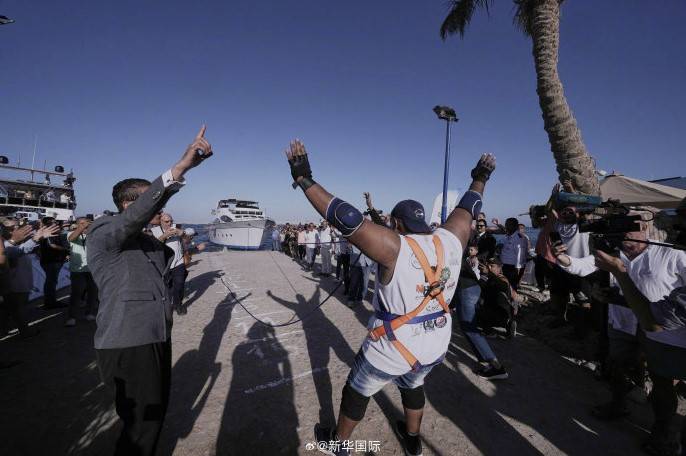 27日,在胡尔加达,埃及人阿什拉夫·马哈鲁斯以一项惊人之举刷新了人们对于人体潜能的认知:他用牙齿咬住绳索,成功拖动一艘停泊在水中的700吨重船。