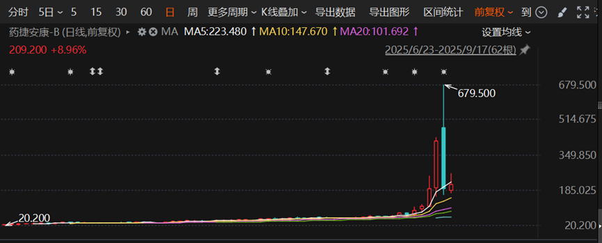 依靠一则利好刺激,药捷安康在9月16日盘中股价一度触及679.5港元/股,较两个多月前的发行价13.15港元/股,翻了足足50倍。
