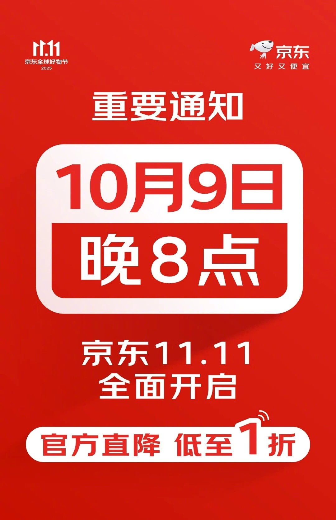 9月29日,京东官方发布重要通知,宣布今年的11.11购物节将于10月9日晚8点正式启动,活动以“官方直降,低至1折”为核心促销主张。此次启动时间定在国庆假期结束后的第一天,较往年有所提前,旨在为消费者提供更充足的购物准备时间和更流畅的消费体验。