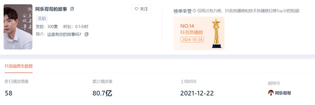 由素人创作的乡村短剧中,据ADX数据,截至目前,播放量最高的乡村短剧为抖音账号“阿乐哥哥”播出的微短剧《阿乐哥哥的故事》,播放总量超80亿。这也是ADX后台播放量最高的微短剧。
