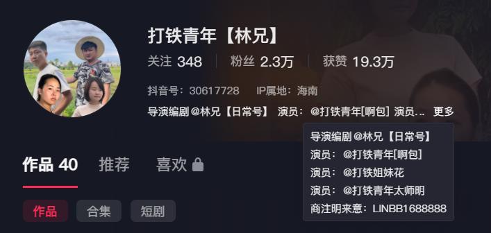 第五,矩阵传播。部分乡村短剧创作者会以各个主演来打造账号矩阵,从而积累更多粉丝量。如抖音账号“打铁青年【林兄】”,就在简介直接标出各矩阵账号入口,通过引流的方式带动矩阵热度。