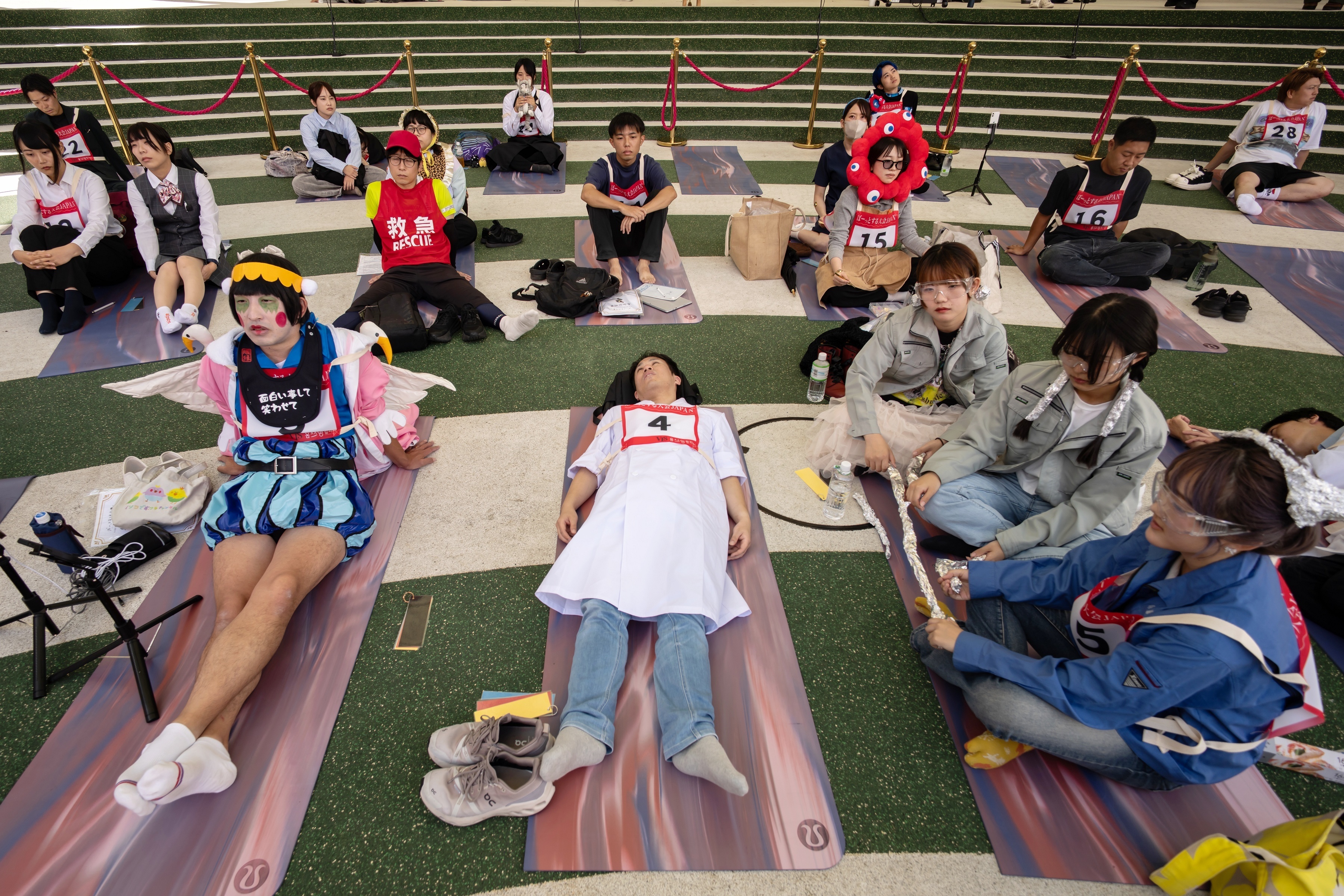 日本大阪世博会举行「发呆大赛」(Space-out),参赛选手们正在发呆放空。9月27日,大阪世博会举行的「发呆大赛」共有40人参加,本次比赛活动由日本搞笑艺人公司发起,参赛者必须在90分钟内保持发呆放空状态,不能看手机、聊天或睡觉,同时需要忍耐搞笑艺人的表演和干扰,最终评选结果将依据心率监测数据和观众投票综合评定。大阪世博会访客人数目前累计超过2200万人次,达到实现盈利的基准线。摄影师:Tomohiro Ohsumi