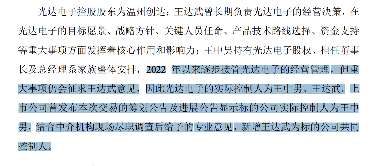 据此前公告,光达电子实控人仅为王中男,而重组草案明确其实控人已变更为王达武、王中男父子。原因是王中男“2022年以来逐步接管光达电子的经营管理,但重大事项仍会征求王达武意见”。
