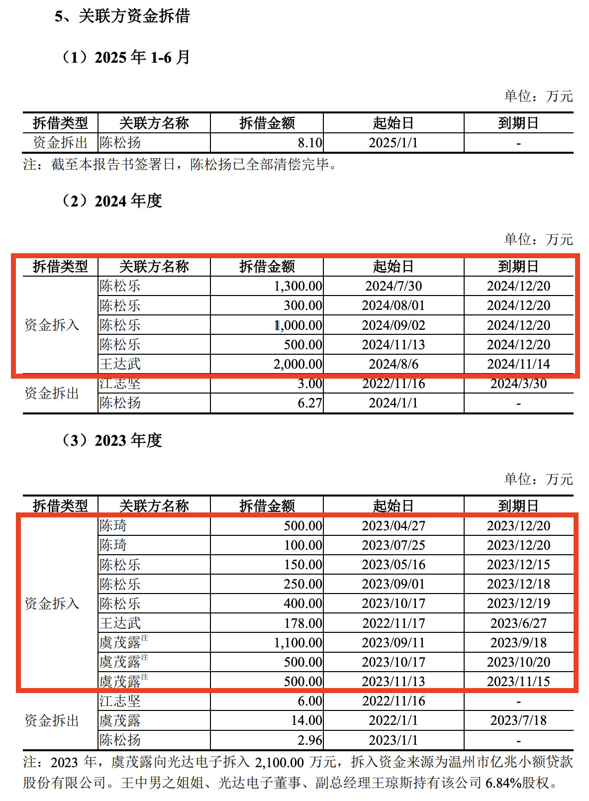2023年和2024年,光达电子存在多笔来自关联方的资金拆入,其中2023年,从关联方拆入9笔资金,合计3678万元,借入的最小一笔资金仅100万元,向同一个关联方合计拆入2100万元,这笔资金由该关联方向一家小额贷款公司借来;2024年,拆入规模进一步过大,共从关联方借入5笔资金,合计5100万元。其资金紧张程度可见一斑。(本文首发于钛媒体APP,作者|张孙明烁)