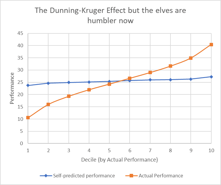 I asked my elves what they expect to output, grouped them by decile of actual output, and plotted their predictions vs their actual output: the result was a perfect D-K graph.