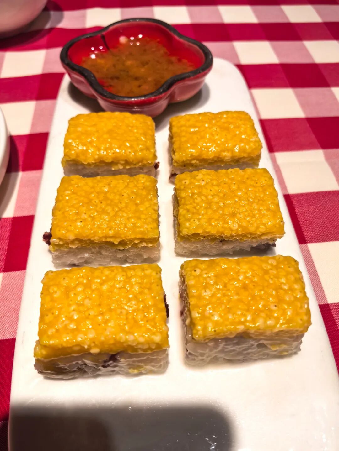 但实话实说,“一直以来都是现做”的说法笔者认为存疑。因为以前吃西贝黄米凉糕,刚端上来时非常“冰”,那种感觉就像是刚从冰箱里端出来,倒很符合“冻品”感觉。