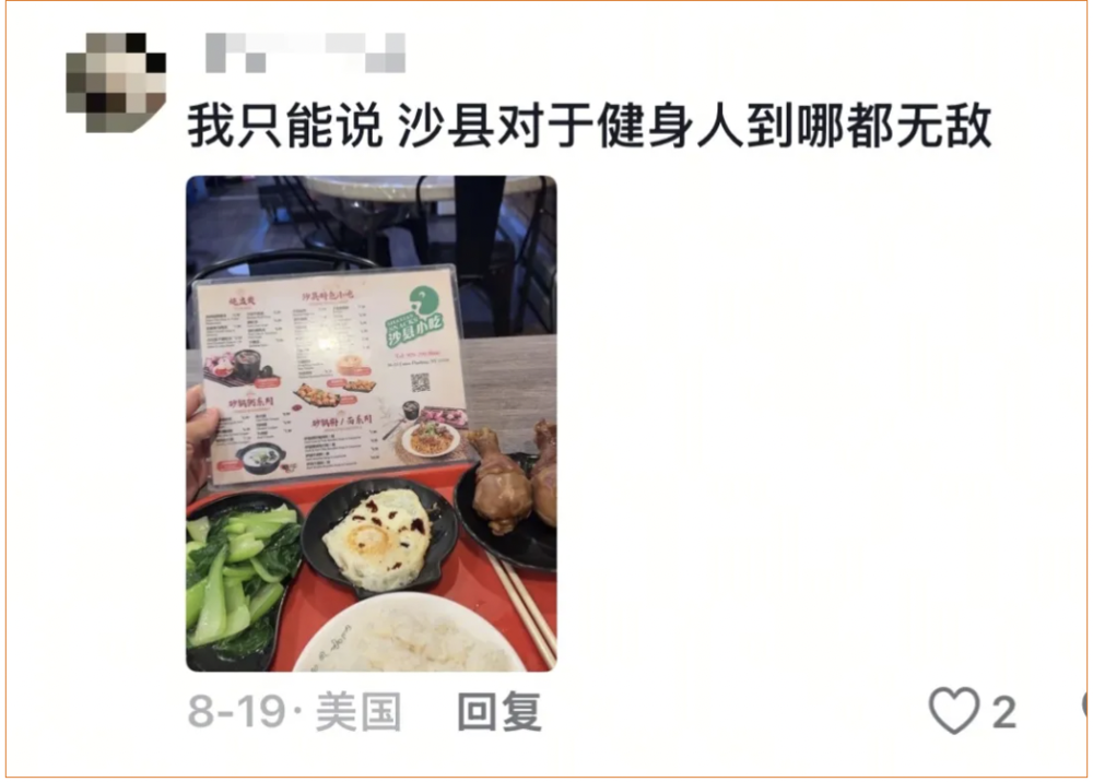 甚至在社交媒体上,“沙县主理人”只需要知道对方的当日体重、当日训练的强度,就能给出一份私人订制的食谱。“今天练腿你要吃四倍碳水,你要吃70克的蛋白质、跟280克的碳水,加上200克的青菜,按照我的吃法明天还能瘦一斤。酷酷一顿操作,比你的私人教练还要靠谱。”