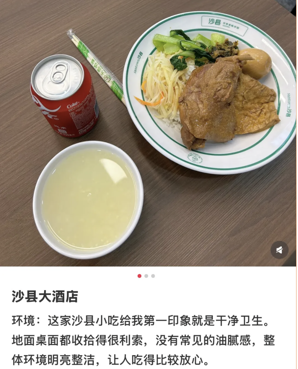 人们对沙县的态度,也会经历质疑、理解、爱上的三个阶段。“年轻时猛猛炫沙县,长大了开始瞧不起沙县,后来才发现,当自己想吃一顿满足的碳水自助时,只有沙县这一‘老款饭’还在原地等着你。两个鸡腿去皮一吃,就是完美的一餐。”