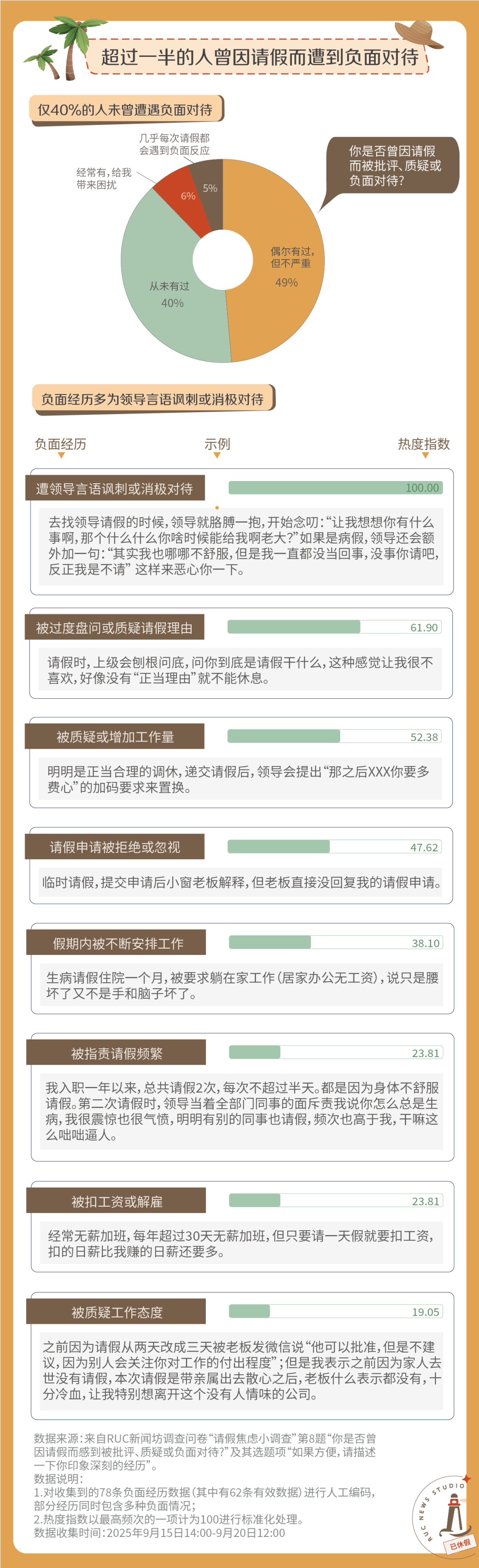 这些焦虑并非空穴来风,而是“吃一堑长一智”的教训。问卷结果显示,有超过一半的人曾因请假而遭受到言语讽刺、过度盘问、质疑、拒绝和惩罚等负面对待。