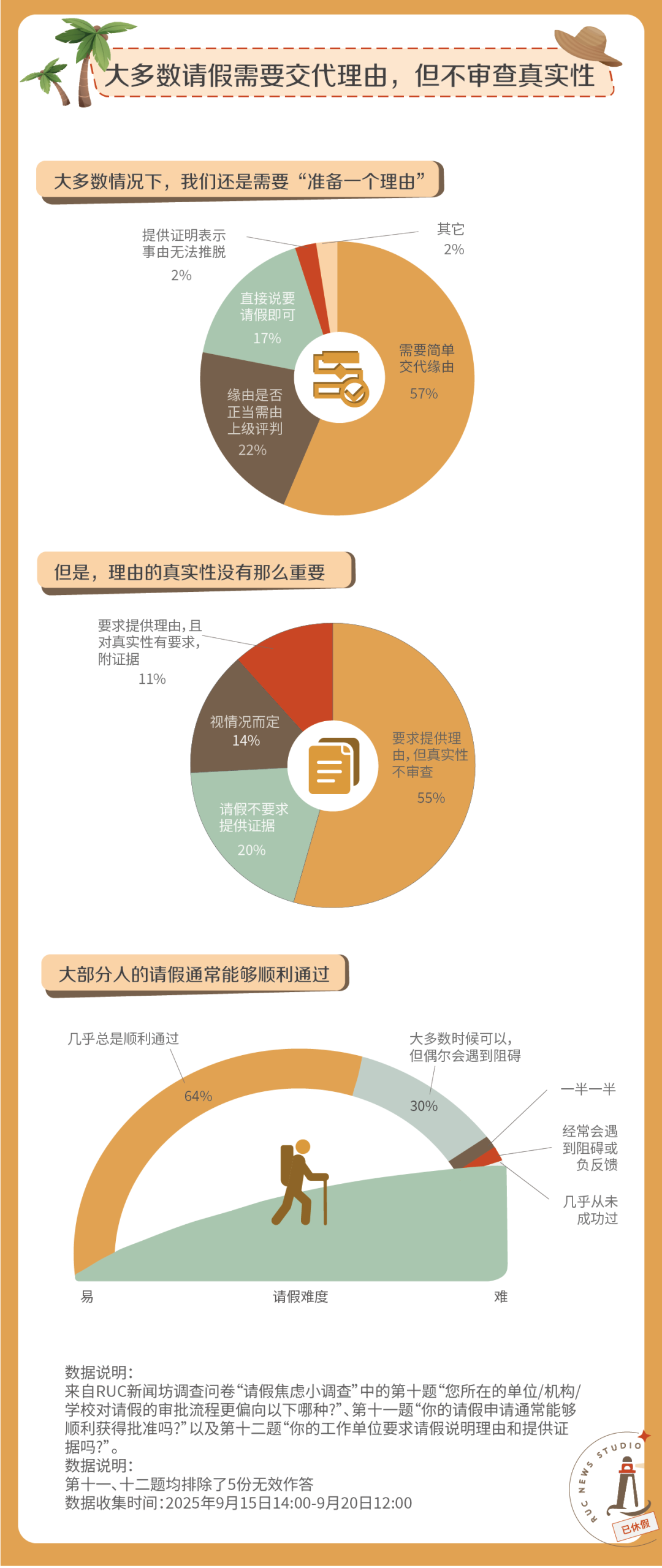 问卷结果显示,除了少数“神仙单位”只需提出申请即可休假外,大部分单位仍需交代请假理由并完成审批流程。而在不同单位之间,对请假理由的要求和审批流程的繁琐程度又存在差异。