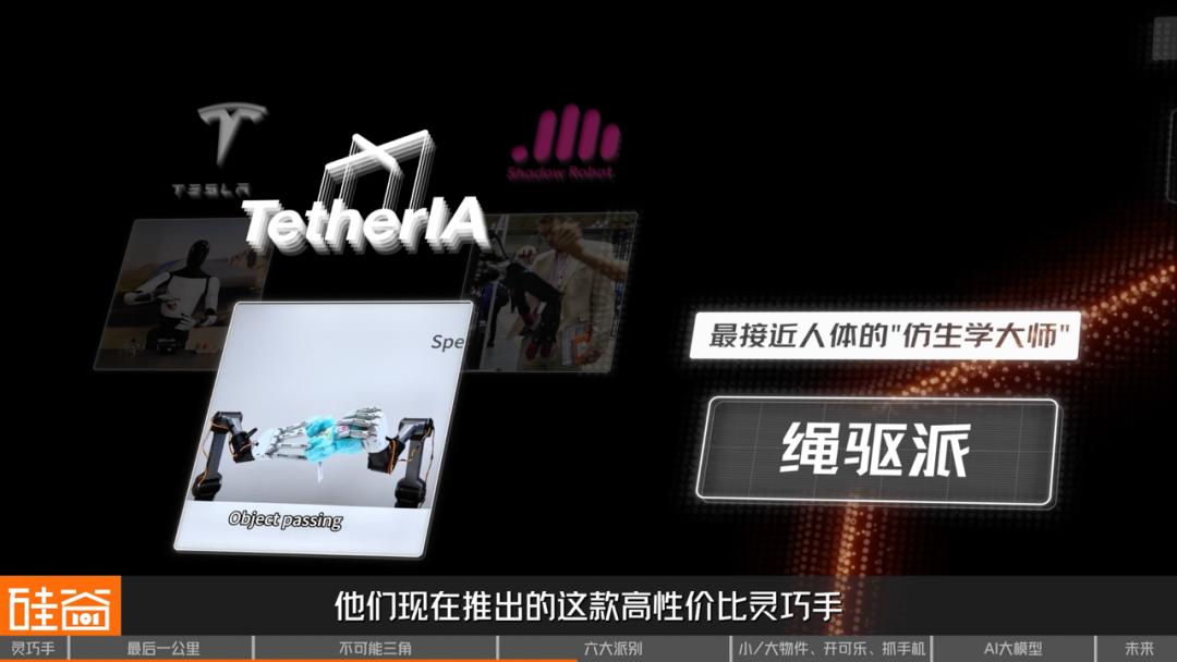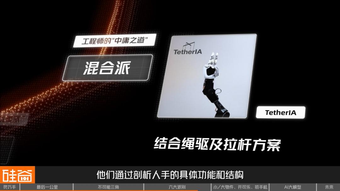 混合方案之前一直停留在学术研究领域,而TetherIA正在通过混合派路线,开发他们旗下的另外一款高自由度灵巧手方案。他们通过剖析人手的具体功能和结构(结合绳驱及拉杆方案),将上面提过的绳驱、拉杆等方案有机结合在一起,通过强大的工程化实现能力,开发出了一款既高效又可靠的高自由度灵巧手方案。