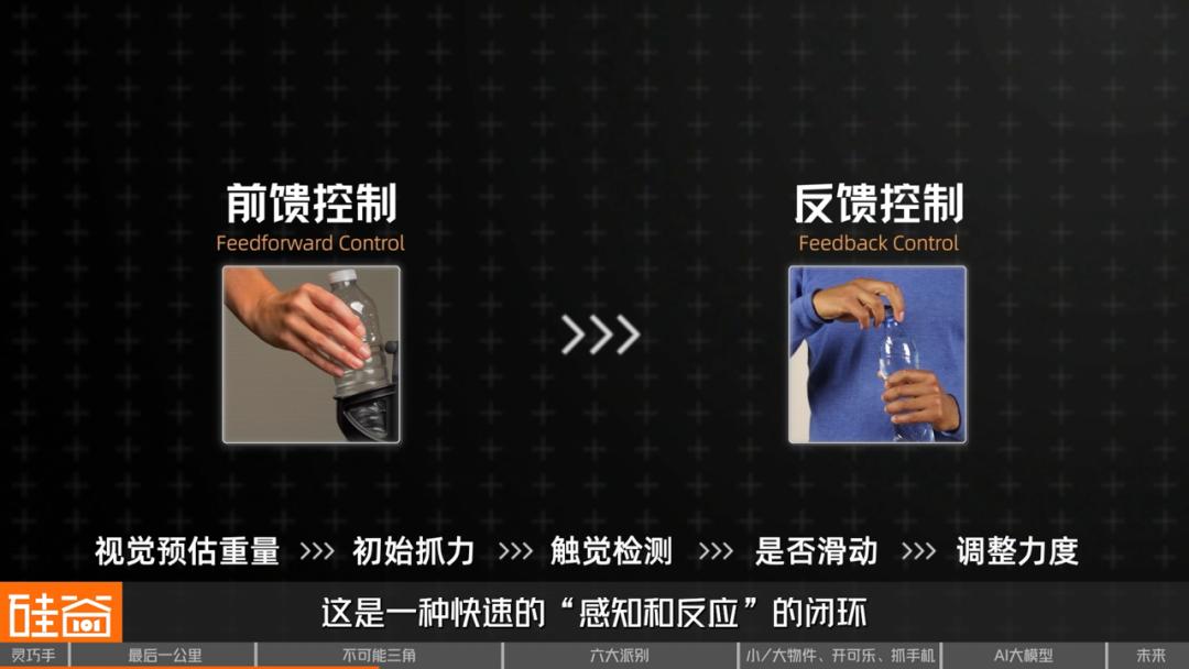 人类抓握力的调整分为两个闭环控制:第一是前馈控制(Feedforward Control),也就是大脑基于视觉和经验,在抓取前预测所需力量。例如,看见一瓶水时,大脑会预估重量,先设定一个初始抓力。