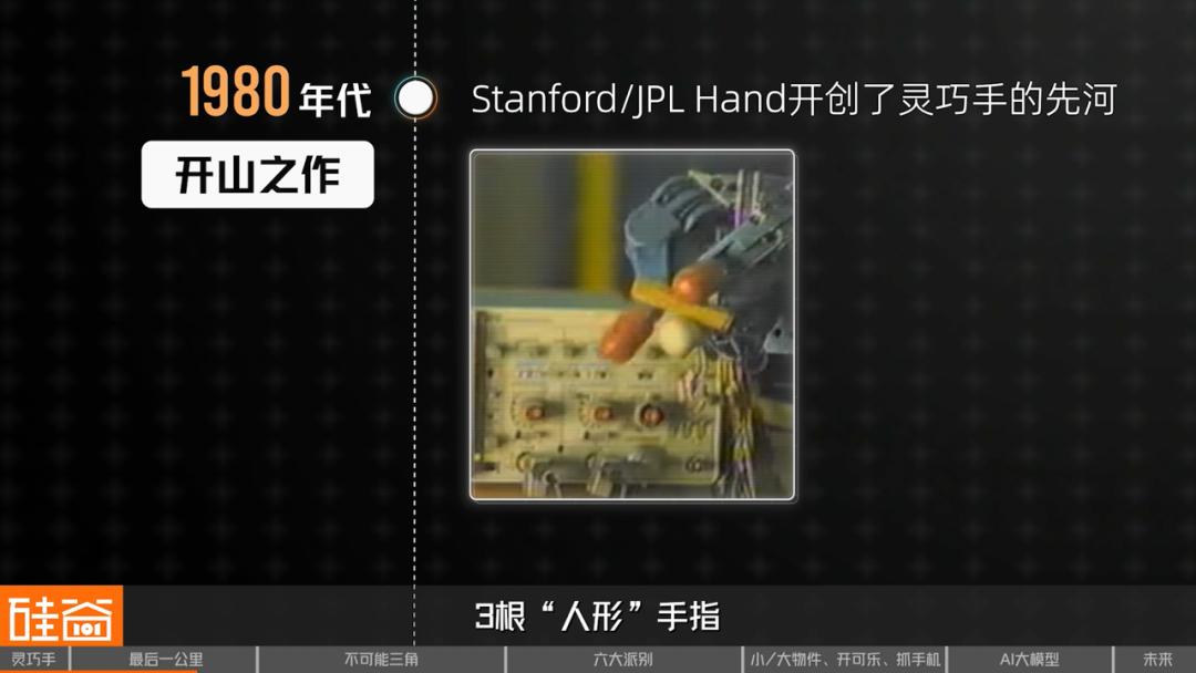 Stanford/JPL Hand开创了灵巧手的先河,3根“人形”手指,每根三个关节,配备触觉/力反馈。但它更像是证明“这事儿能做”的概念机。