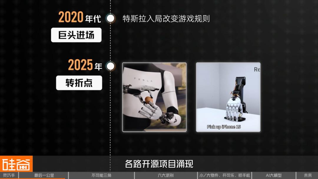 特斯拉22个自由度的新手、TetherIA的300美元开源革命、各路开源项目涌现。灵巧手即将迎来“智能手机时刻”——从极客玩具变成人人可得的工具。