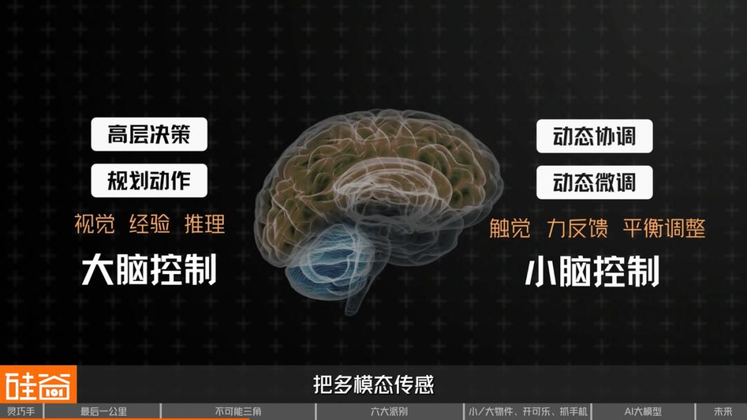 如果灵巧手要完全复制人手的这个反馈闭环,需要的不只是传感器和控制算法的堆叠,而是一个更接近人类神经系统的分层控制架构。可以类比为“大脑控制”和“小脑控制”:大脑控制依赖视觉、经验和推理,用于规划动作和做出高层决策;而小脑控制则依靠触觉、力反馈和实时的平衡调整,负责细节上的动态微调与协调。