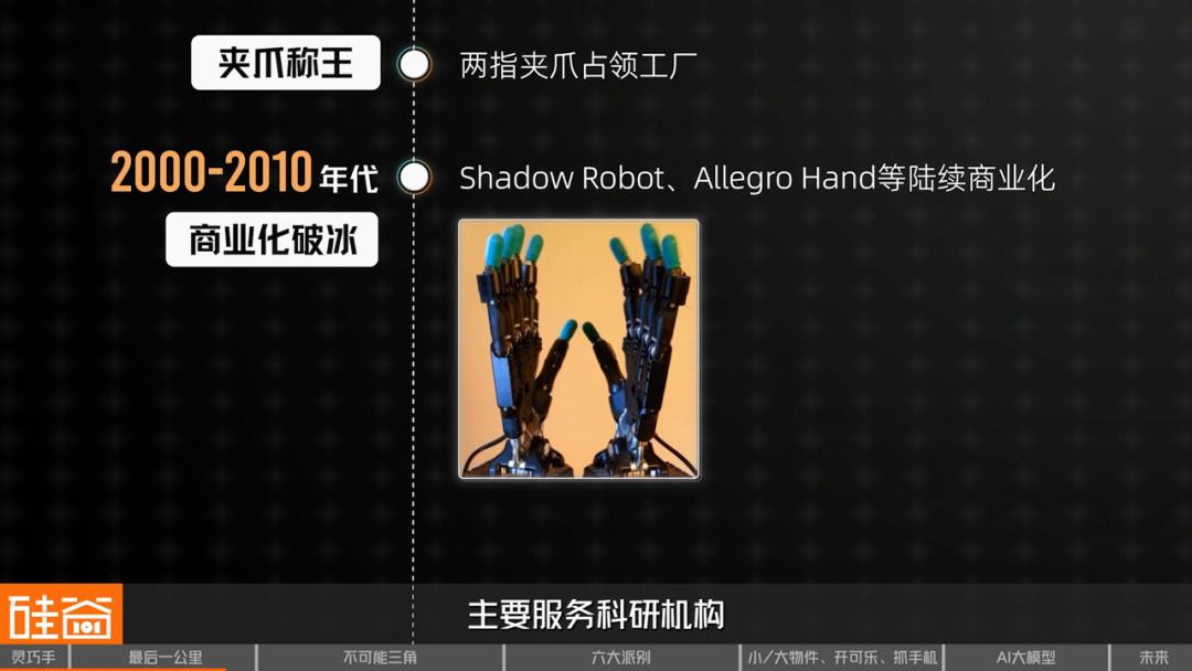 Shadow Robot、Allegro Hand等陆续商业化,价格高达数万美元,主要服务科研机构。这个阶段就像早期个人电脑——功能有了,但普通人买不起。