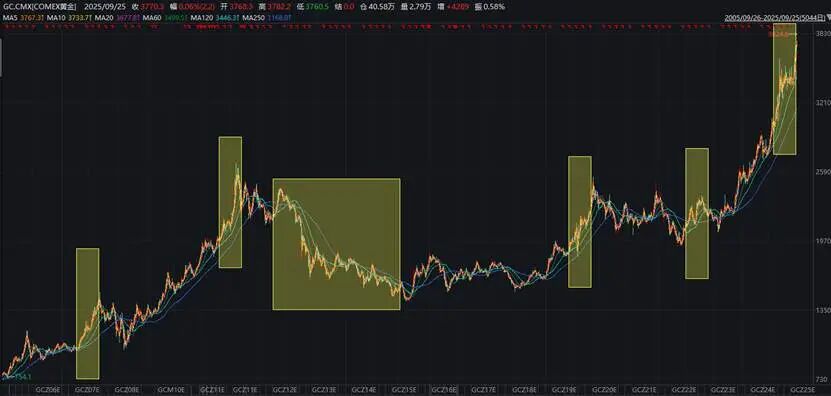 黄金从250美元/盎司涨至1920美元/盎司(历史第二高点),7年约涨7倍,年化涨幅33%。