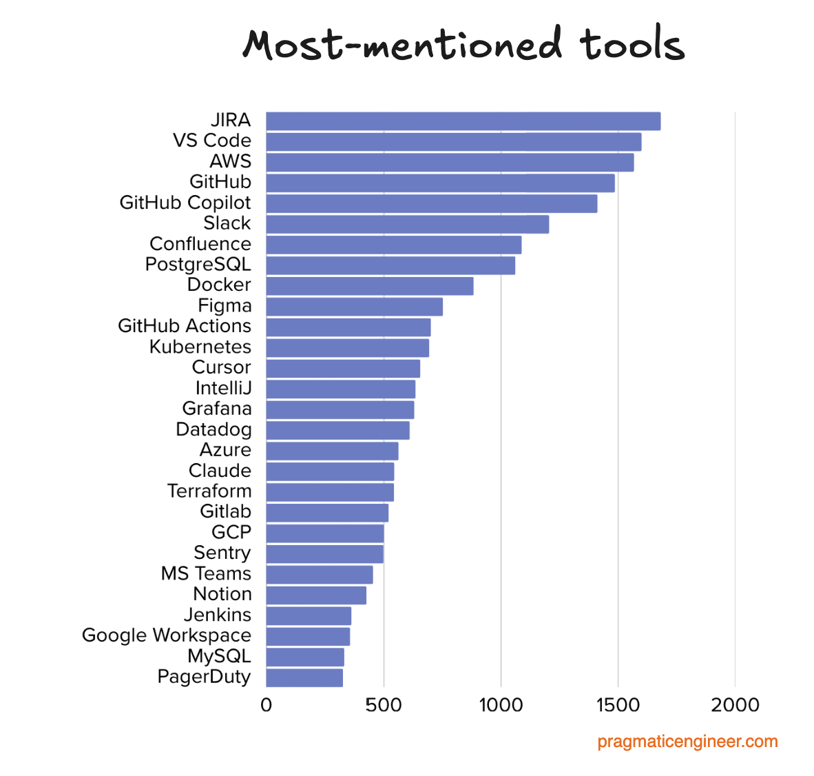 JIRA is the most used tool. More software engineers work with JIRA than with VS Code or AWS – which is a surprise! It’s known that JIRA is widely used across tech companies, and the survey replies reveal just how much.