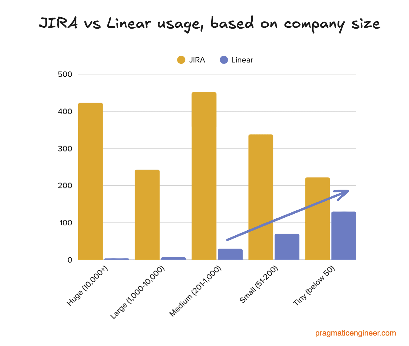 JIRA dominates at large companies, while Linear is surging at smaller ones this year. Let’s see how often JIRA and Linear are mentioned, by company size:
