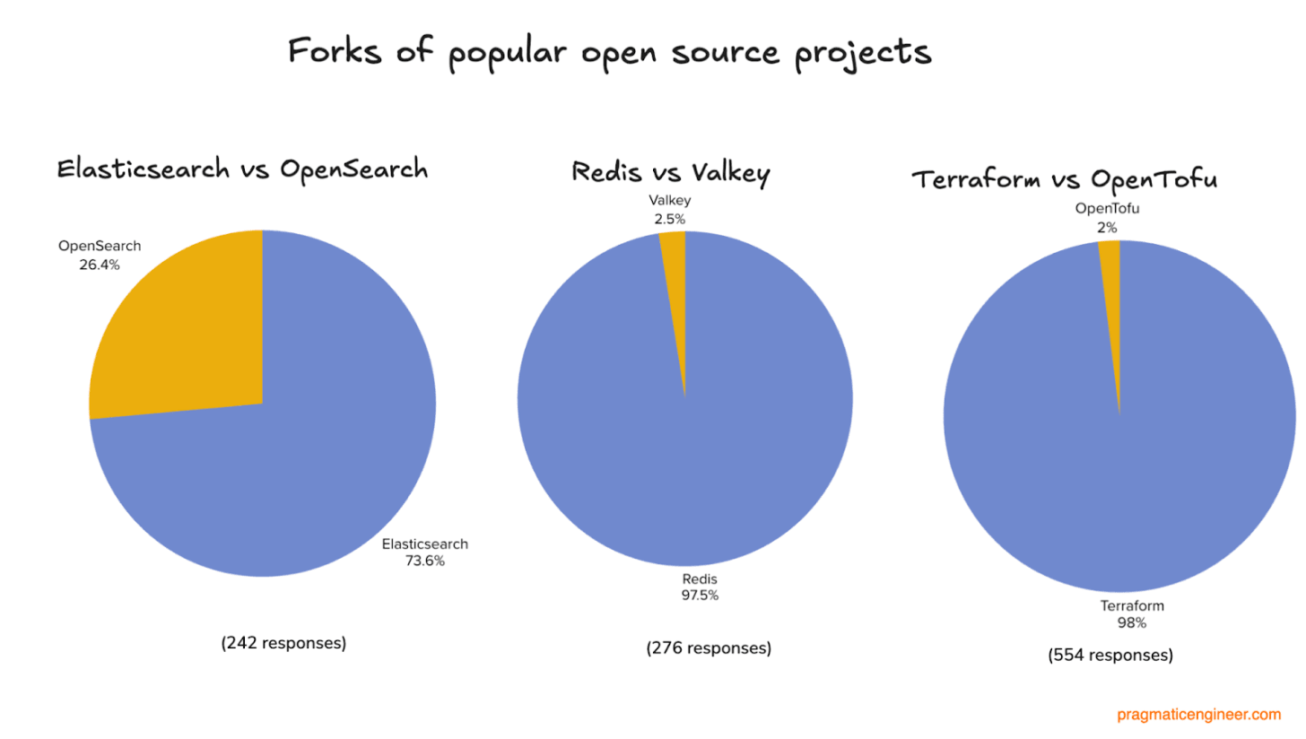 Forks of popular open-source projects. OpenSearch seems to be eating into Elasticsearch’s market share, while Valkey and OpenTofu seem not to have persuaded many developers to drop Redis and Terraform.